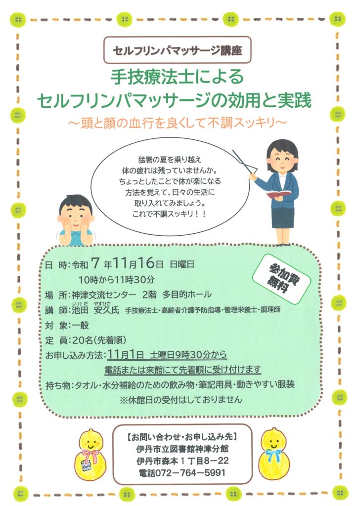 セルフリンパマッサージ講座終了しました 2025年11月7日 最終更新日時 : 2025年11月16日 図書館神津分館 講師の先生にリンパマッサージの基礎を教えていただきました。たくさんの方々にご参加いただき、ありがとうございました。